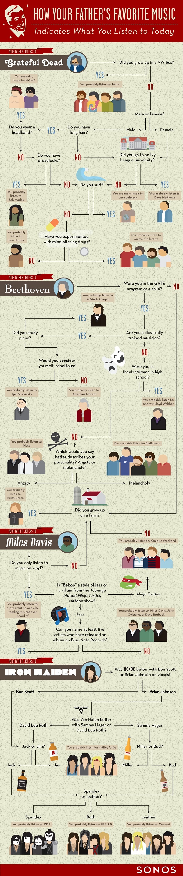 Quasi sempre non esiste una ragione concreta in grado di spiegare perché ascoltiamo una certa tipologia di musica o preferiamo un gruppo rispetto a un altro, ma di sicuro in un momento della nostra vita siamo stati influenzati anche e soprattutto dalla musica ascoltata dai nostri genitori. Per questo motivo Sonos ha realizzato un’infografica che risponde alla domanda: le abitudini di ascolto di tuo padre cosa dicono dei tuoi artisti preferiti di oggi?